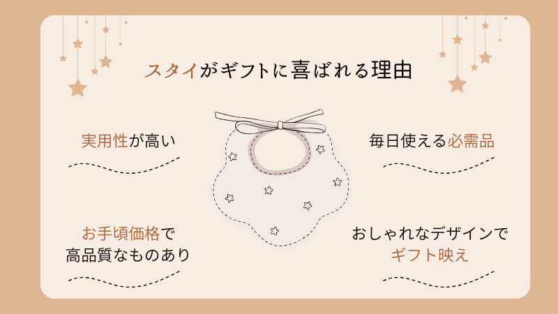 高価すぎるものは気を使わせてしまうし…と思う時にぴったりなのが「スタイ」です。毎日使えて実用的、しかもデザイン性の高いものも多く、プチギフトに最適!